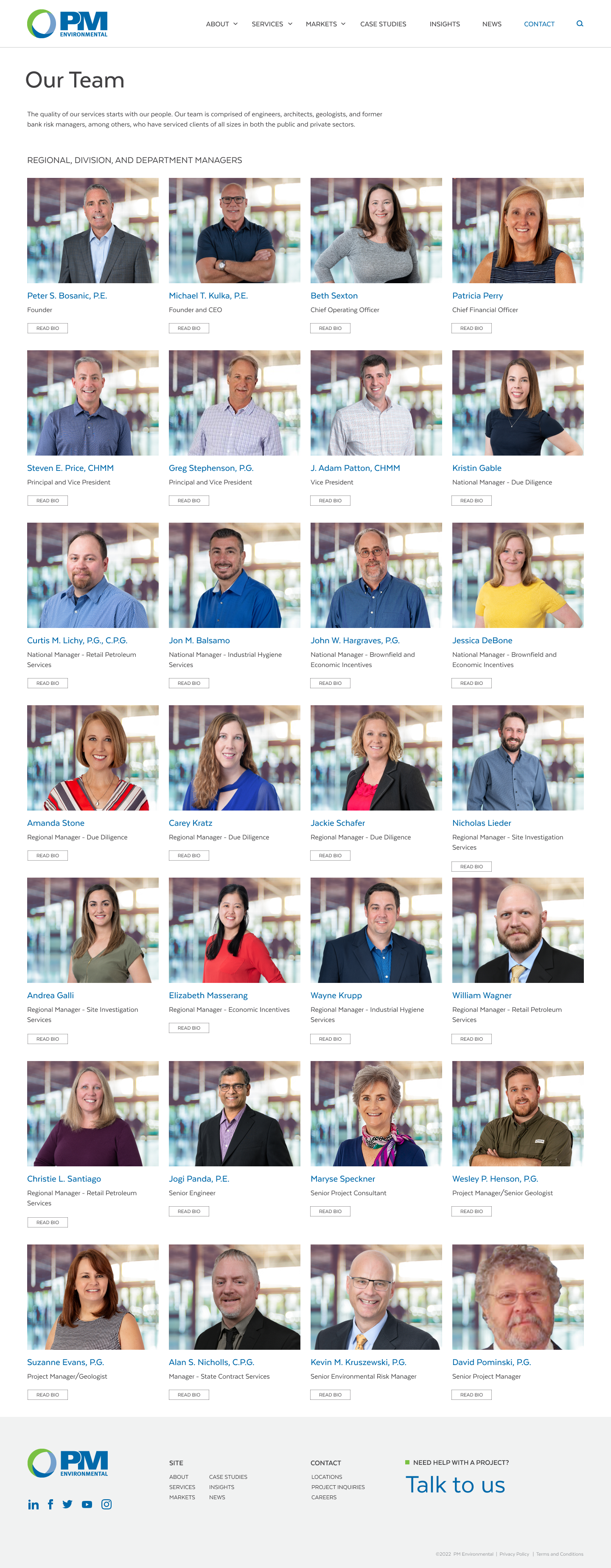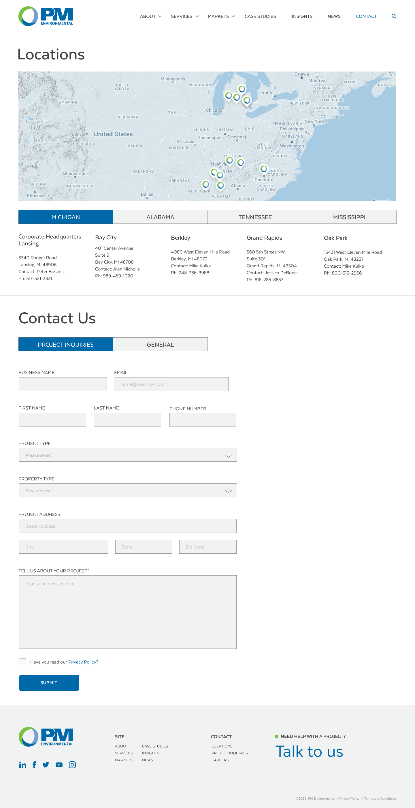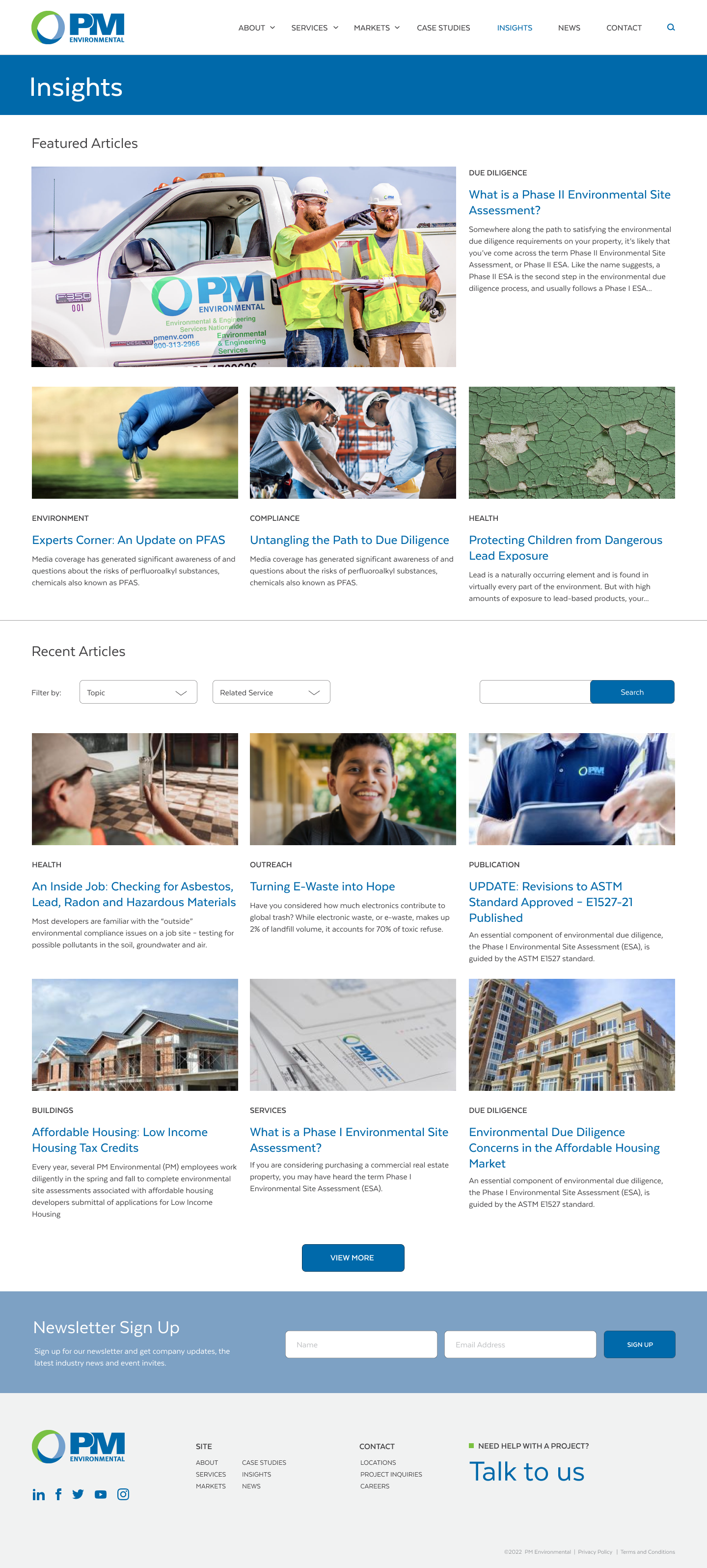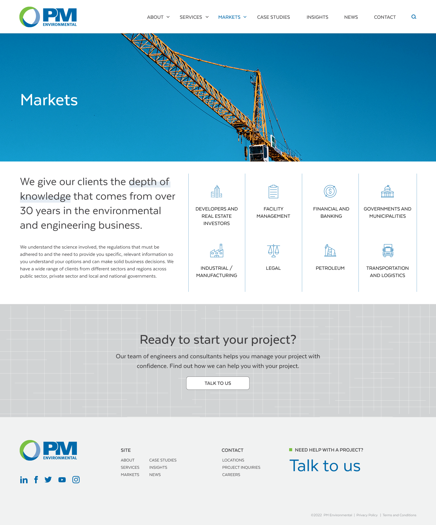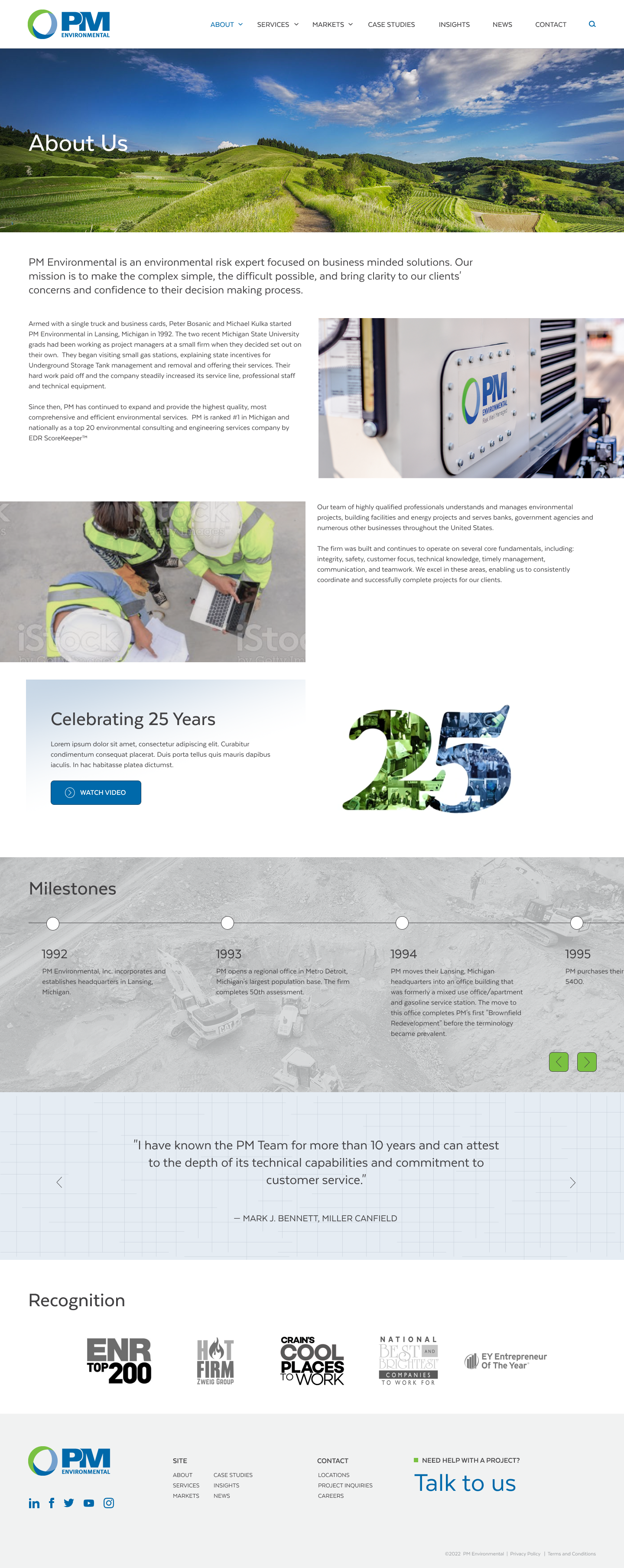 PM Environmental, a Pinchin company, is an environmental risk expert focused on business-minded solutions. PM Environmental had an outdated website using generic stock photography, a trendy font and a static layout. They needed their branding on the web to be brought up to date so that the website could convey the value of their services.